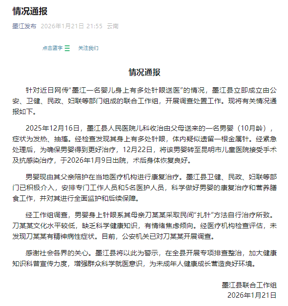 针对近日网传“墨江一名婴儿身上有多处针眼送医”的情况,墨江县立即成立由公安、卫健、民政、妇联等部门组成的联合工作组,开展调查处置工作。现将有关情况通报如下。