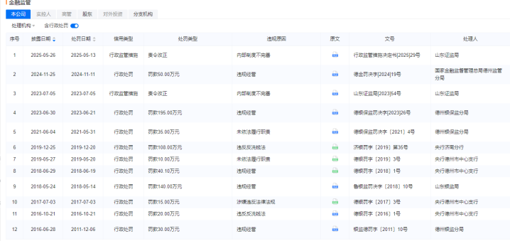因代履职严重超期,该行被罚金50万元。2024年11月,国度金融监督管制总局山东监管局发布行政处罚决定书,德州银行因存在代为履职东说念主员超期履职,严重违背审慎绸缪划定的主要作歹事实,被罚金50万元。