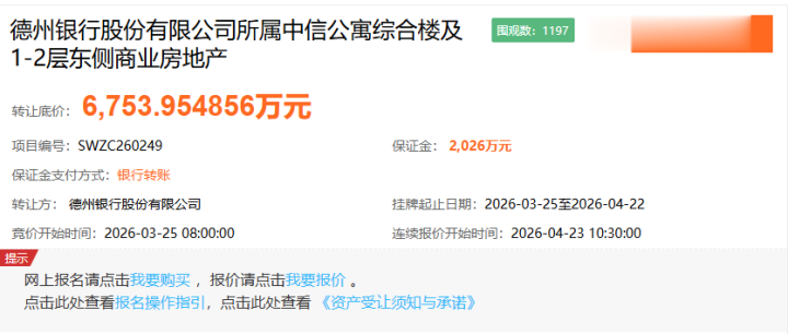 日前,山东产权来回中心分解,德州银行股份有限公司(简称“德州银行”)挂牌出售旗下中信公寓概括楼及1-2层东侧生意房地产,底价约为6753.95万元,挂牌截止手艺为4月22日。结束4月20日,引来1197次围不雅。