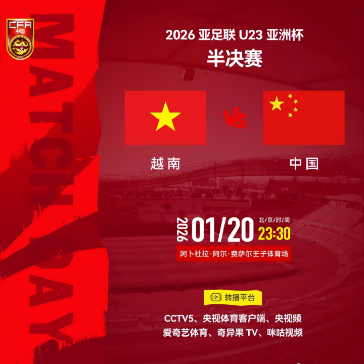 北京时间2026年1月20日23:30,U23亚洲杯半决赛将迎来一场注定被反复讨论的较量——中国U23对阵越南U23。这不仅是东亚与东南亚足球的一次正面对话,更是一场风格、理念与青训成果的集中检验。