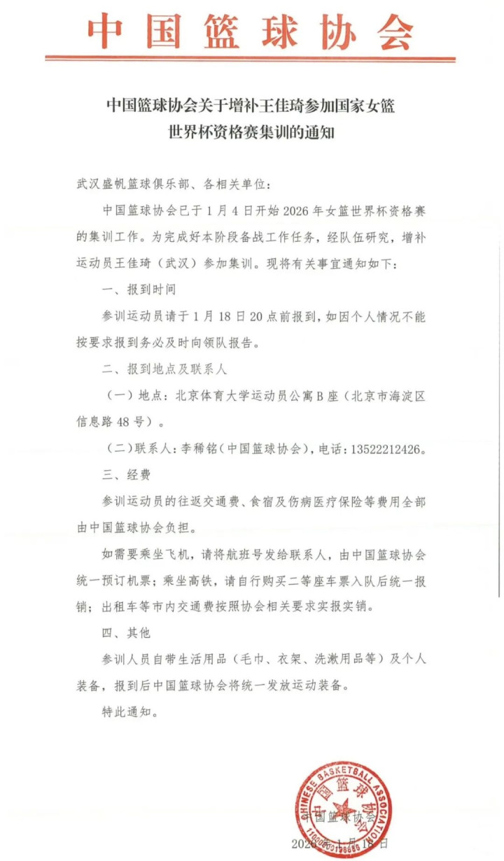 此外,入选上一期中国女篮大名单的张子宇要随时做好被国家队征召的准备。因为张子宇很久没有参加过正规的高强度比赛了,所以篮协和山东女篮商量,先让张子宇留在WCBA联赛找找状态,然后视情况而定。不过就在此刻,篮协下达重要通知,为完成本阶段的备战任务,经过队伍研究决定,来自武汉盛帆黄鹤女篮的本土球员王佳琦入选国家队集训名单。