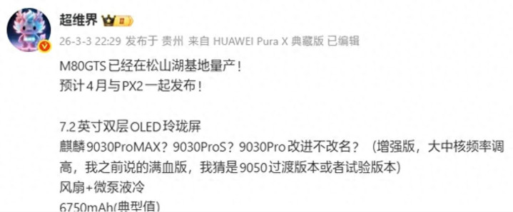 近日博主“超维界”放出重磅音讯,华为Mate 80 GTS也曾阐发量产,展望4月份就会和传闻中的Pura X2同步亮相,这对花粉来说,十足是盼了许久的“强心针”,再也无须苦苦恭候了!