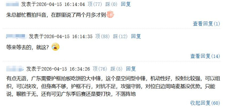“有点尴尬,广东需要护框抢板吃饼的大中锋,这个是空间型中锋,无邪性好,投射比较强,不错组织,不错快攻,但身高不够,护框不行,拒抗不及,攻强守弱,对位白边周琦麦基没上风。只可说,一丁点儿,还有可见广东季后赛照旧要打快,不落阵脚。”
