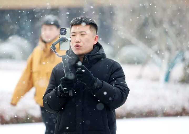 1月17日,2026年雄安新区的第一场雪悄然降临,一位年轻的网络主播在容东片区冒雪进行直播。河北日报记者 刘光昱摄