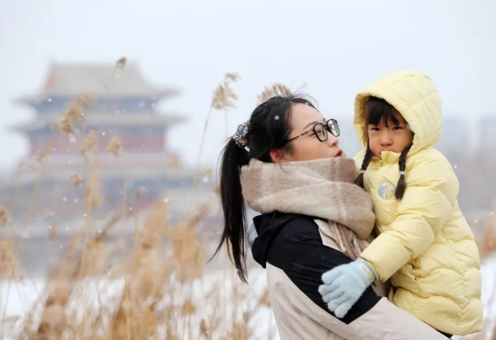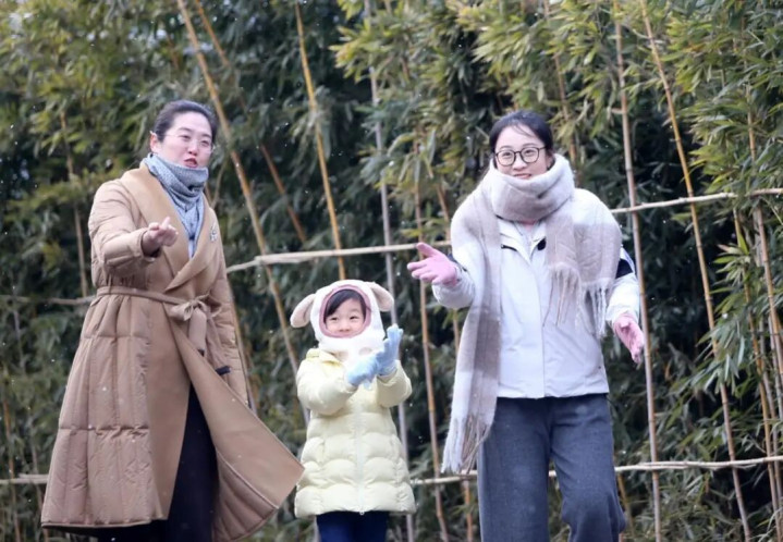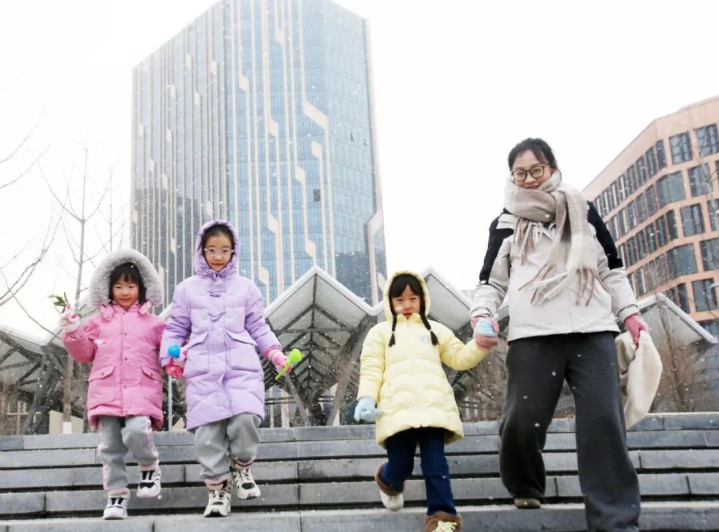 1月17日,2026年雄安新区的第一场雪悄然降临,雄安容和悦泽幼儿园的老师们和孩子一起在公园里看雪,让孩子们记录雄安美丽的冬天。河北日报记者 刘光昱摄