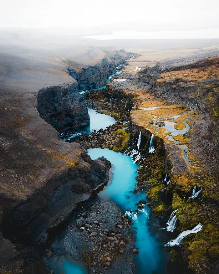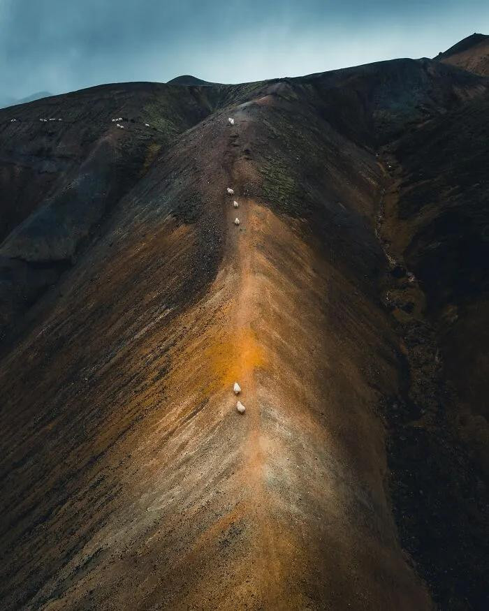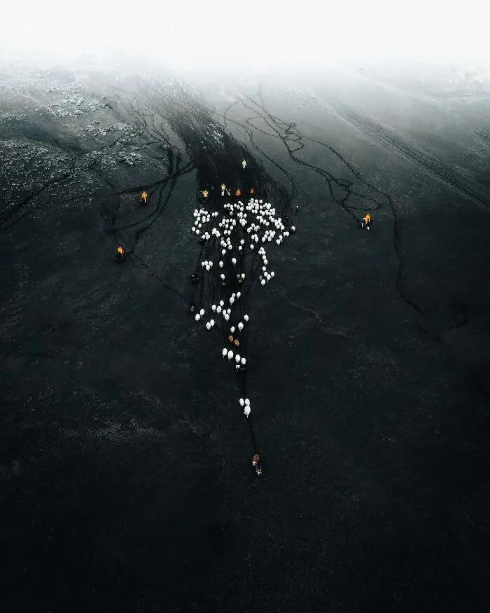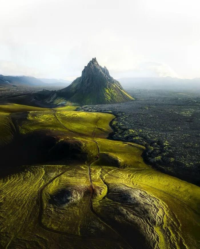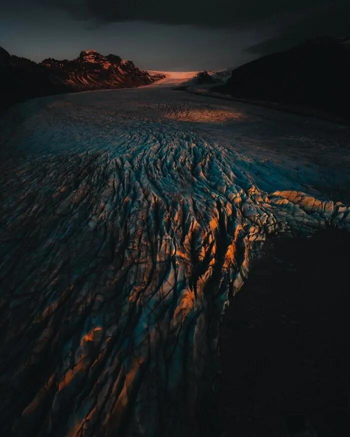 他平直把镜头怼进了冰岛的灵魂里——火山口像地球睁开的眼睛,冰川河流在高空看像是外星生物的血管头绪。