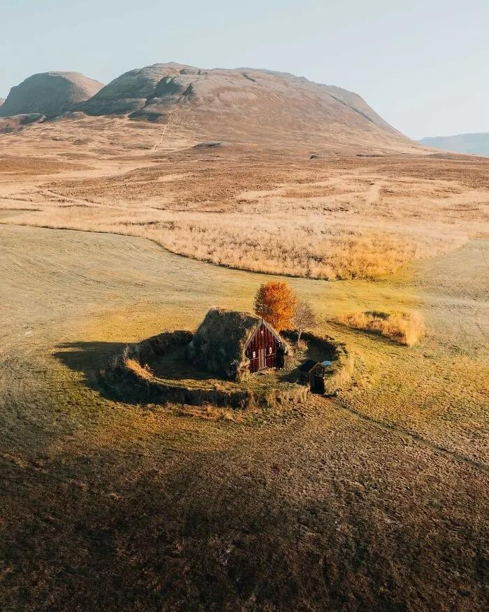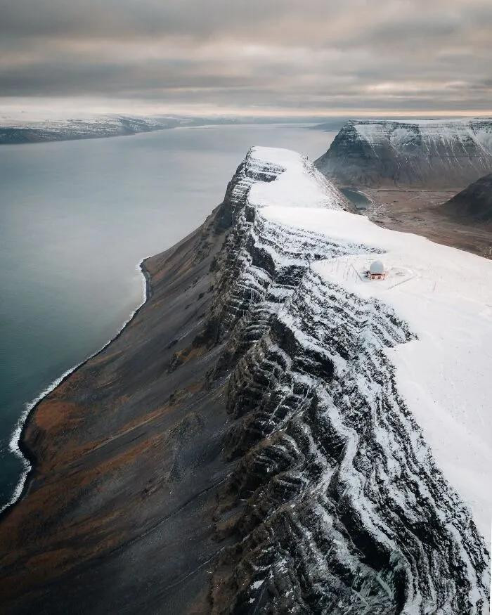 他会在漫天彻地的雄伟苔原里,放进一个孤零零的小教堂;在潸潸缭绕的玄色山峰线上,留住一个险些看不见的徒步者身影。就那么一丁点的东说念主造物,片刻把整张像片的“孑然感”拉满。