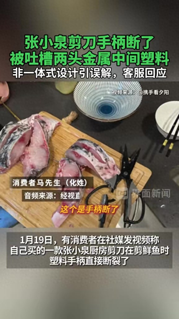 1月19日,有网友在社交媒体发布视频称,自己买的一款张小泉品牌厨房剪刀在剪切鲜鱼时,塑料手柄直接断裂。他仔细观察后才发现,该剪刀的手柄并非传统的一体式钢材包胶结构,两头是金属,中间却是塑料。他认为,剪刀手柄非一体式钢结构,两端却露出金属的设计,容易误导消费者。1月20日,张小泉客服售后工作人员回应记者称,已登记此事,将向上级反馈,随后联系到网友,表示将补寄一把新剪刀。