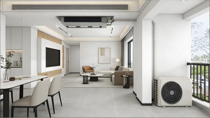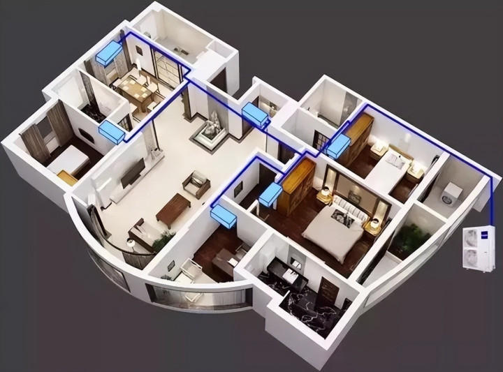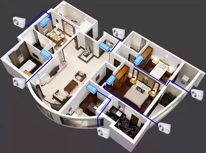 情况三:120平米以上大平层或复式,层高2.8米以上,预算饱胀,家里经常多个房间同期开空调。中央空调是正解,一台外机带多台内机,外立面干净,送风均匀舒畅。